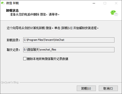 卸载过程自动检测微信聊天记录,并提供是否删除操作(默认不删除)。