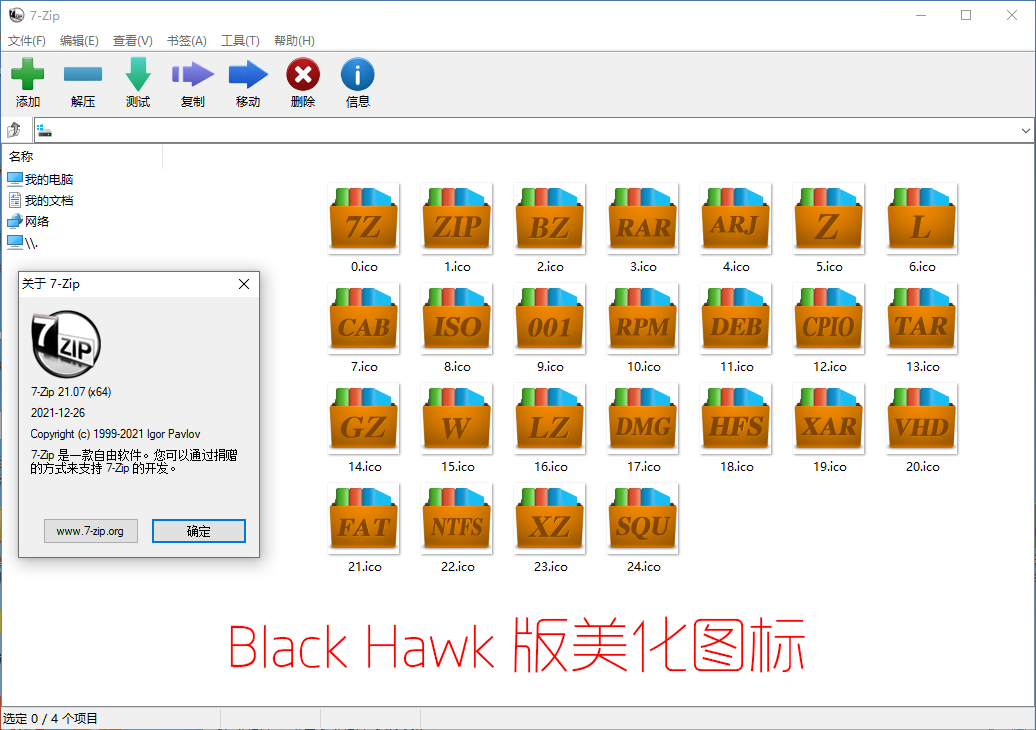 我的习惯是安装时候取消勾选关联常见格式,安装好以后再在7-zip设置里选择自己需要关联的格式(因为我同时还在用WinRAR),图标不改变,显示还是原版默认图标。